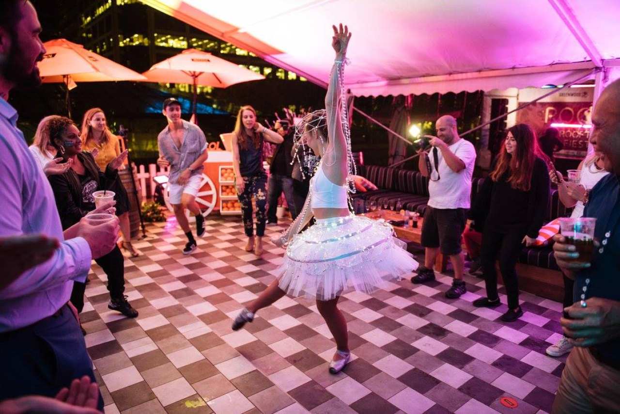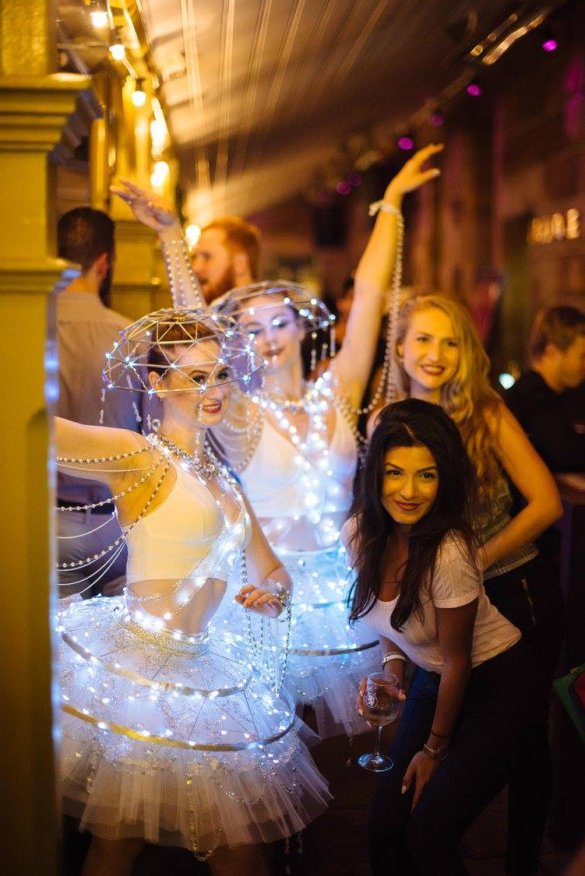 Our petite ballerinas resplendent in full tutus will plié and chassé around the event space brightly lit by LED lights strung around themselves to resemble a chandelier.